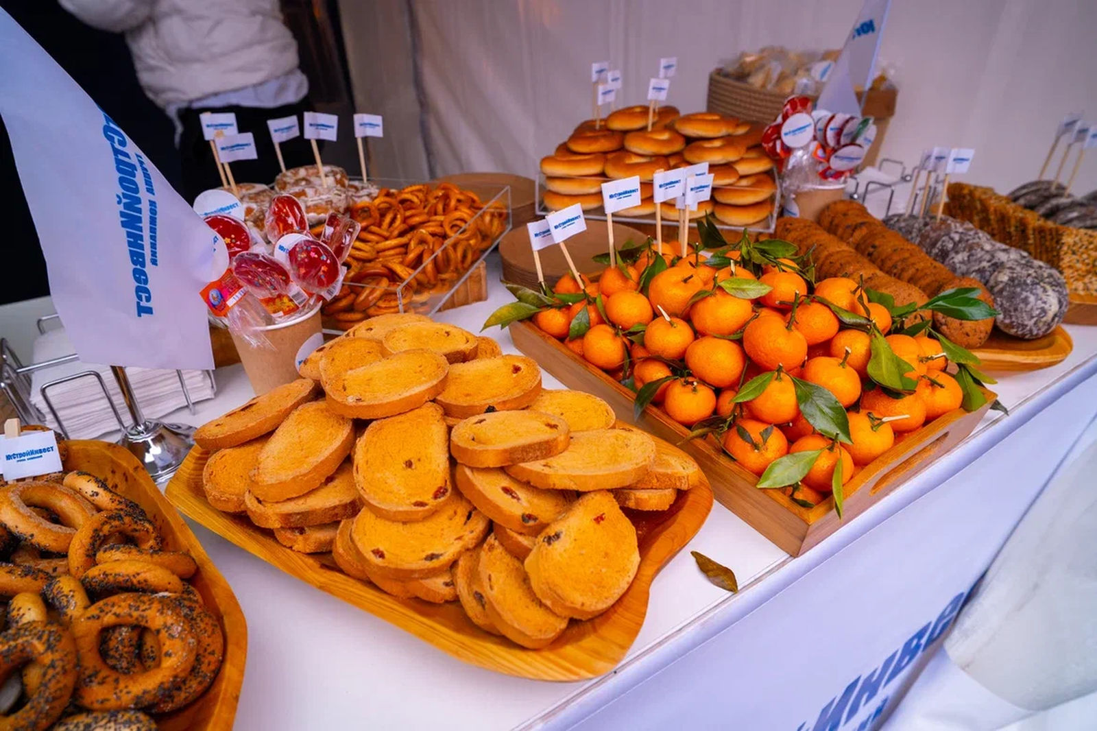 По традиции всех присутствующих ждал шатер с аппетитными угощениями. Гости попробовали горячий чай с облепихой, безалкогольный глинтвейн, ароматный кофе со сливками, а также пряниками, сушками и другими сладостями, которые особенно пришлись по вкусу детям и взрослым в зимний день.