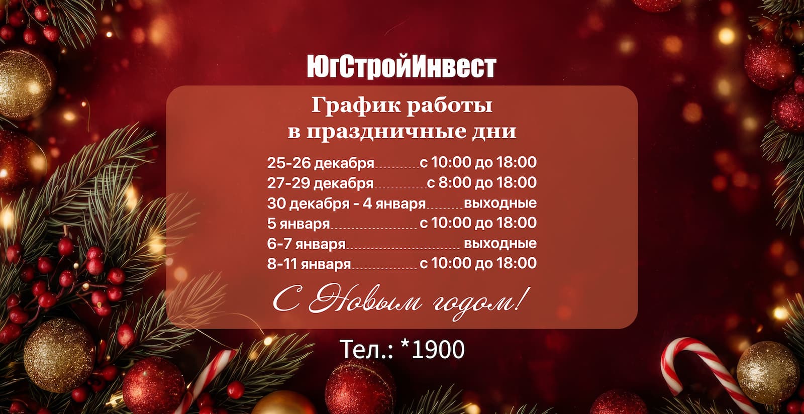 График работы ГК «ЮгСтройИнвест» в новогодние праздники