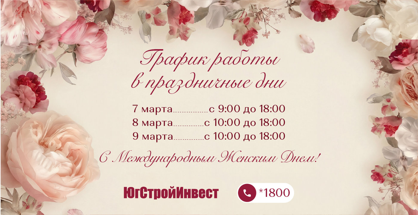 График работы офисов ГК «ЮгСтройИнвест» в праздничные дни к 8 Марта