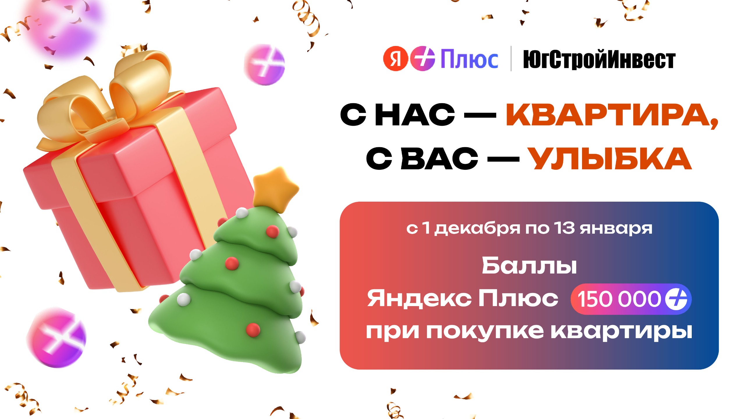 Новогодний баллопад от ГК «ЮгСтройИнвест»: квартира + 150 000 баллов «Яндекс Плюс»!